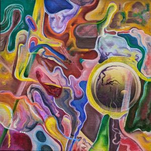 “Since a young age, I have been fascinated by the world inside us,” Arlambakova says in her artist statement, “how these complex systems develop and work together to help us function…Through the visual play of colors, textures and shapes in each painting, I aim to arouse the curiosity of the viewer and lure them in for a closer look, hoping to elicit a dialogue about their relationship with their own anatomy.”