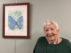 Artist Dawn Griffis is a retired RN and NP whose artistic expression is influenced by her upbringing in England and her deep love of the natural world. Now living in rural Vermont, Dawn continues to create art despite a tremor and progressive vision loss from macular degeneration, drawing on her vivid memory to create her artwork. Her evocative pastels portray the delicate bluebells, peonies, and cowslips that she recalls from her childhood and the birds that she’s observed both in England and Vermont–rose-breasted grosbeaks, robins, and blackbirds. “I love birds. I loveflowers,” she says.